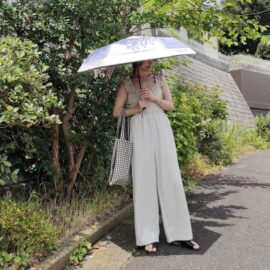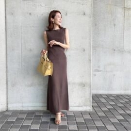 ベージュ色のコーデを大人っぽく決めるなら、定番の「黒バッグ」に頼るのが正解。差し色としてはインパクトが弱めですが、落ち着いてシックに決まるのが魅力です。