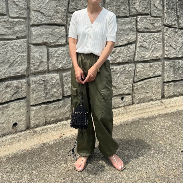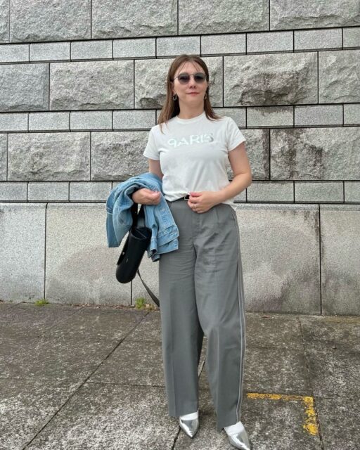 ワイドシルエットのパンツを穿くときは、きれいめなポインテッドトゥのシルバーパンプスがおすすめ。ゆったりとしたボトムを程よく引き締めてくれますよ。