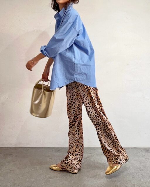 これは洋服だけではなくバッグなど小物でも同じ。ゴールドの靴はレオパード特有の華やかさと相性がよく、コーデの完成度がグッと高まる組み合わせです。