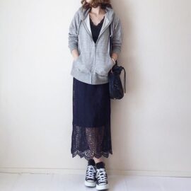 ショートブーツがすんなり決まるのはやっぱりスカート。ショートブーツが黒なら「黒のロングスカート」がお似合いです。色味を揃えるとスカートとブーツの境目が曖昧になり、脚が長く見える効果あり。