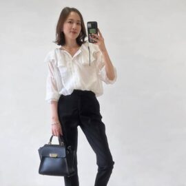 こちらはトレンドの白ボトムスを合わせた、今年らしいコーディネートです。白いパンツに白いスニーカーのホワイトコーデは、この夏に是非取り入れたい合わせのひとつです。差し色で取り入れたトリコロールカラーのクラッチバッグで、気分はパリジェンヌ♪