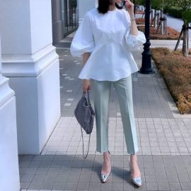 シンプルなデザインもぺプラムトップスを合わせればフリルで甘く、ウエストくびれ強調で女性らしさを惹きたたせてくれます。モデルさんのようなマニッシュなイメージのワイドパンツもぺプラムと合わせれば大人のきれいめカジュアルコーディネートが叶います!