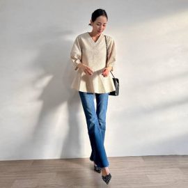 最後にデザインも裾がペプラムであったり、軽くVのように胸元がカッティングされていた方がよりインナー感をなくし、おしゃれなトップスに見えてくれます。