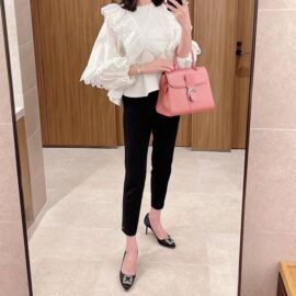 思いきって白のボトムスを合わせれば、ピンクの色味も引き立ち春らしい装いにグンと見栄えします。