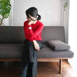 ピンドットのブラウスに柔らかいベージュのパンツスタイル。ここまでは優しい風合い、そして赤のカーディガンを羽織ることによりガーリーにもなります。
