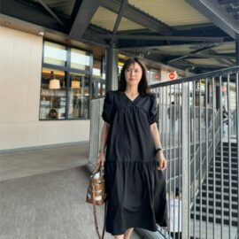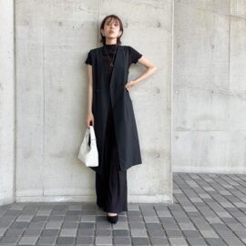 ワンピースならコーデに悩む事なく、1枚でサラッと着られるので便利ですよね。いつもならブラックやホワイトを選びがちですが鮮やかな赤もおすすめです。とろみ感のある素材なのでこなれ感のある上品な雰囲気にまとまりますね。ワンピースが主役のコーデなので小物は控えめなカラーを選べばまとまりが良くなります。