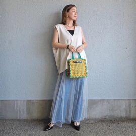 ニットのクラッチバッグがアクセントになっていて素敵ですね♩