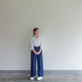 オフィスでも使えそうなコーデは、爽やかで大人っぽいので男性ウケも◎ フリルがついたネイビーのトップスで、レディライクな印象をプラスして。ボトムをホワイトにして、上品で夏っぽいスタイリングを楽しんでみてはいかがでしょうか。