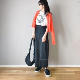 こちらのスナップは、サンフラワーイエローのボトムをプリントTに合わせたコーディネート。カジュアルなTシャツがビビッドカラーのスカートやパンツでこなれたおしゃれに♪