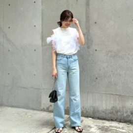 今季もシンプルなTシャツと同様に大人気のノースリーブTシャツ。ハイウエストタイプのデニムパンツでトップスインにする着こなしが、シンプルだけど余計なものを削ぎ落とした究極の大人カジュアルです。
