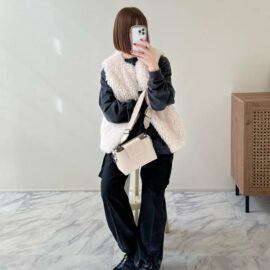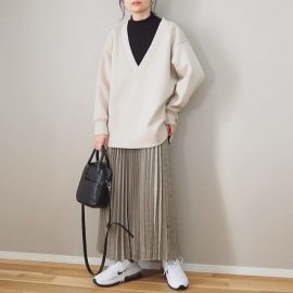 今シーズンおすすめなのが、Vネックでワイドパンツシルエットのブラックオールインワン。ゆるっとラクチンな着こなしなのに、深いVネックとブラックですっきり引き締まった印象に仕上がります♪