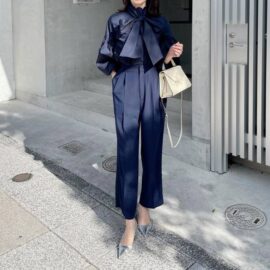 中でもおすすめはフェミニンなブラウスときれいめなパンツのコンビ。ジャケットタイプよりもスマートに見える上にコーデの堅苦しさを回避。マナーを押さえつつ、今どきのルックスに決まりますよ。