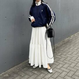 女っぽいロング丈のタイトスカートが、カジュアルなMA-1を大人の着こなしに。ホワイトカラーで揃えた上下に羽織ったブラックのMA-1が、細身のIラインをつくってくれているのもポイントです。足元のスニーカーでカジュアル感を追加したら、フォーマルなかっちりしたバッグで小物でも全体のバランスを取って。