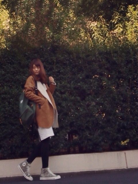 きれいめコートにはタイトなカジュアルパンツとスニーカーを