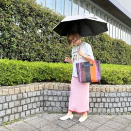 雨が続くと、気分もなかなか上がらないもの。そんなときはカラフルなレッドの傘やお気に入りの柄の傘で盛り上げたいですね。スナップのようにビニールバッグとカサの色を揃えると、オシャレ度数も気分もアップ!