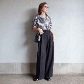 ハイウエストにコルセットのようなデザインのあるスカートやパンツを使って、最旬なコーディネートはいかがでしょうか? トップスをインしてパンツの布面積を多く見せることで、スタイルアップも狙えます♪