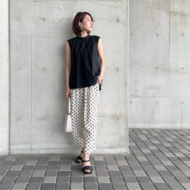 色の効果でコンパクトにまとまるブラックのノースリーブ。どんなボトムに合わせても失敗しないので、ノースリーブデビューするならブラックを選ぶのがおすすめです。