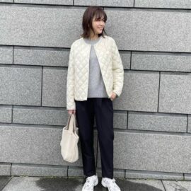 ステッチがないことで、ダウン独特のもこもこしたシルエットにならず大人っぽい雰囲気に。カジュアル感が抑えられるため、レストランや同窓会などのお出かけシーンにも似合います。