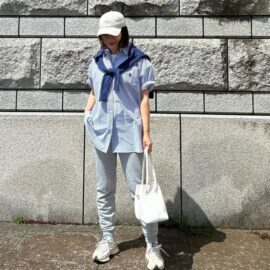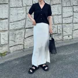 カジュアルな生地感やデザインのものをチョイスすると、頑張りすぎないおしゃれが完成。上下お揃いの生地感が効いて、程よくきちんと感のあるコーディネートに仕上がります。