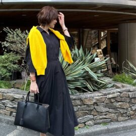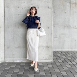 レディなレッドカラーのスカートが目を引くコーデ。夏にピッタリのリネン素材で、軽やかさもアップされていますね! ミモレ丈のスリット入りスカートにスニーカーを合わせて、大人のカジュアルスタイルが完成。ブラックのバッグで引き締めることにより、まとまりのある着こなしに仕上がっています。