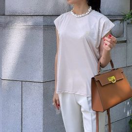 大きな胸を目立たせないのにおすすめなのが、適度に開いたネックラインとゆるめなトップスイン。襟が詰まっていると太って見えやすくなるので、胸元が見えない浅めのVネックや大きめのラウンドネックがベターです。