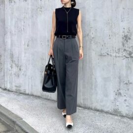 「サロペットが似合うのか心配……」というフェミニン派さんにおすすめしたいのは、スムース素材の上品なデザイン。華奢なストラップが甘さのあるサロペットなら、デイリースタイルに取り入れやすいですよ。インにはブラックのタンクトップを合わせれば、細見え効果も抜群。今季らしく抜け感のあるコーデが叶います。