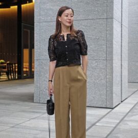 今回ご紹介するのは、総レースブラウスのインナーコーデ。それでは、コーデをチェックしてみましょう!