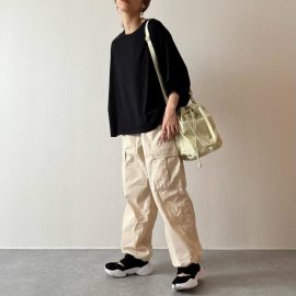 観覧席に座る場合は、脚が楽ちんなワイドパンツもおすすめ。ゆったりサイジングのシャツで、今っぽいカジュアルコーデに♪