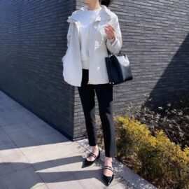 シンプルな黒パンツや定番感のある白シャツやボーダーを合わせることで、ドラマチックなイメージのパンプスのハードルが下がり、普段のコーディネートに取り入れやすくなります。