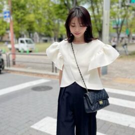 - 遊び心のあるトップスときれいめパンツで華やぎコーデ
