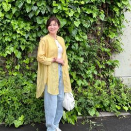 最初に紹介するのは、春らしい色使いが印象的なロゴトートバッグ。トートバッグというとシンプルな印象がありますが、ロゴがあるだけでグッとおしゃれにシフト! しかし基本はプレーンなので、定番のデニムパンツやブラウスとも相性抜群です。モデルさんはスニーカーと色を合わせて、まとまりのある春コーデに仕上げています。