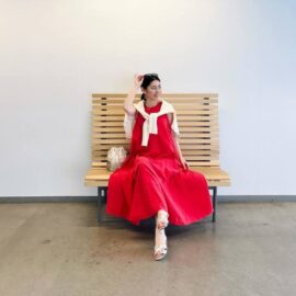 ワンピースだけで十分フェミニンなため、足元はフラットシューズやスニーカーでOK。無理なく履けるシューズであってもおしゃれに決まります。