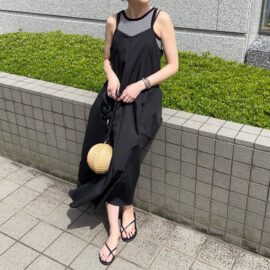 着痩せ見えを叶えるなら、テロンとしたキャミワンピースがイチ押し。ボリュームを抑えた落ち感のある生地がIラインシルエットを強調し、全身をすっきり見せてくれます。