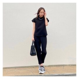 プレイフルなワンショルダーデザインのテーパードパンツに合わせているのは、ブラウンのフレンチスリーブカットソー。「肩見せはイヤ!」という大人世代にも、フレンチスリーブはイチ押しです。肩まわりを優しくカバーし、品のあるコーデを叶えてくれますよ。ブラック・ホワイト・ブラウンなどベーシックカラーを揃えておくと、大人の夏コーデに大活躍するはずです。