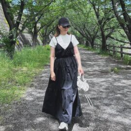 ボリューム感たっぷりなマキシ丈ワンピースでも、清潔感たっぷりで爽やかに仕上がるのはホワイトカラーならでは。フェミニンなギャザーやフレアワンピースの場合、素朴なリネンやコットン生地で取り入れることで、サラリとナチュラルに仕上がります♪