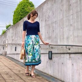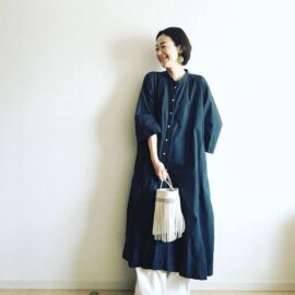 柄ワンピース特有の子どもっぽさを解消するなら、ダークカラーの小物で全体に引き締め感をプラスしましょう。