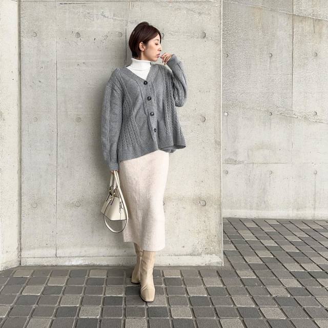 Vネックカーディガンにはタートルネックニットもとてもよく合います。ふんわり質感のカーディガン×白タートルの組み合わせは、女性らしく清潔感ただよう着こなしに。冬のデートにもおすすめのスタイリングですよ。