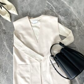シャープなVネックも、ボリューミーな胸をスッキリ見せるのにお役立ち。谷間が見えないよう、浅めのVネックラインを選ぶのがポイントです。収縮カラーで取り入れると、コーディネートが引き締まりますよ♪