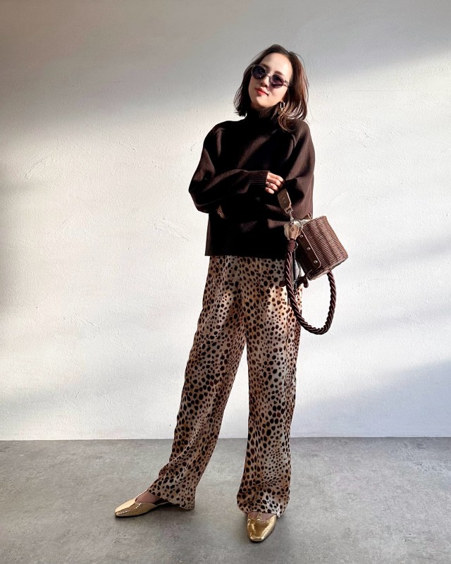 ダークブラウンはちょっと派手な柄モノに合わせてもおしゃれにまとまります。スナップでは、ダークブラウンニット×レオパード柄パンツでキャッチーなスタイリングに。