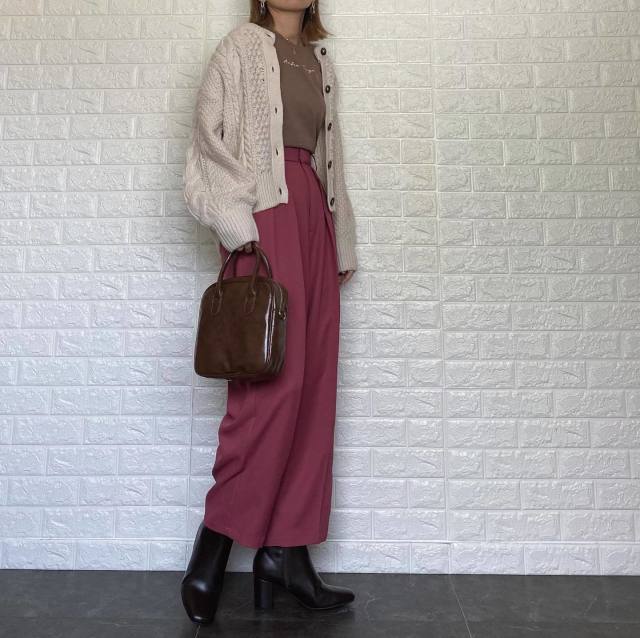 ダークブラウンは小物で取り入れてもそのおしゃれさを最大限に発揮できますよ。例えばこちらは、こっくりとしたピンクカラーパンツの足元にダークブラウンのブーツをプラス。黒を選びがちな足元ですが、あえてダークブラウンにすることで少し優しい印象にシフトします。特に淡い色や可愛げカラーのボトムスを使ったコーデでバランスアップできますよ。