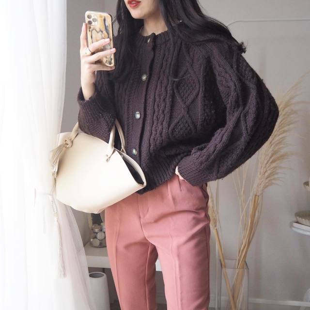 スナップは、ダークブラウンのニットカーディガンを主役にしたコーデ。立体感のあるケーブル編みをセレクトすることで、ダークブラウンの濃厚な色合いも奥行きアップ! ピンク合わせで可愛くまとめています。