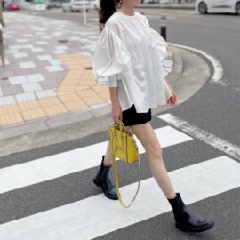 次にご紹介するのもブラックのショートパンツセットアップ。マットな色味のセットアップには、シアー素材のシャツが抜群に合います。さらにトレンドのミントグリーンなど淡い色味を選べば、今の季節らしい軽さのある着こなしにランクアップ。