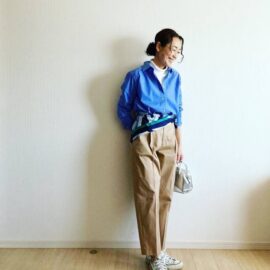 次に爽やかで親しみやすい「ブルー」を使ったコーデをご紹介! ボトムなど色の面積が大きい場合、他のアイテムは主張の少ない落ち着いたカラーのみでまとめるのがコツです。中でもおすすめはシックなブラック。隣り合うカラーを際立たせる効果が絶大なんです。