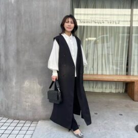 カジュアルなノーカラージャケットを羽織って、襟元スッキリ!