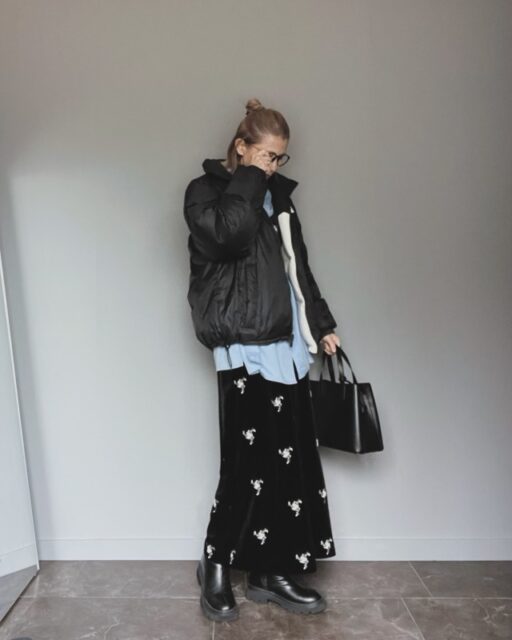 花柄が目を引く黒のベロアロングスカートもおすすめ。1点投入するだけでベーシックなコーデも大人モードな雰囲気に。