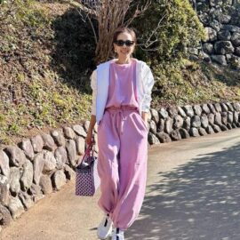 ジャンパースカートは適度に広がるゆったりめのシルエットを選ぶと、着心地のよさも申し分なし。ランチビュッフェなど、たくさん食べたい日にもおすすめです!
