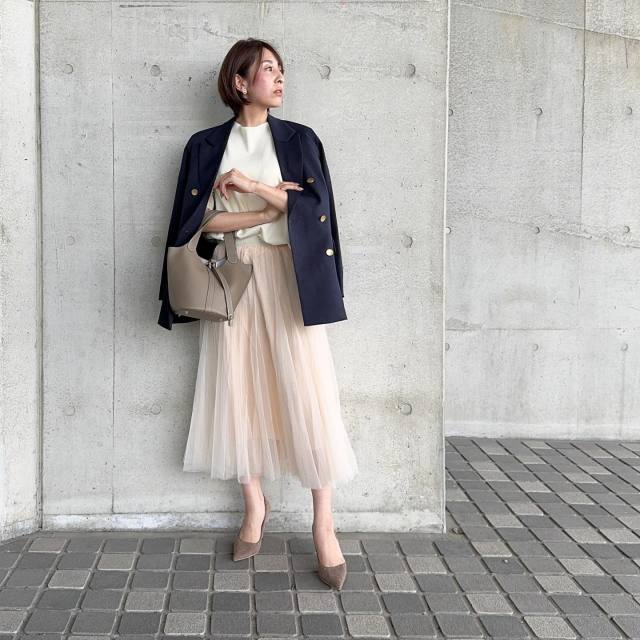 同じネイビージャケットを使ったスタイリングも、ベージュチュールスカートを合わせるとフェミニンな印象に変化。しっとりしたネイビージャケットとふわふわ繊細なチュール素材からコントラストが生まれ、より奥行きを感じるスタイリングに仕上がります。