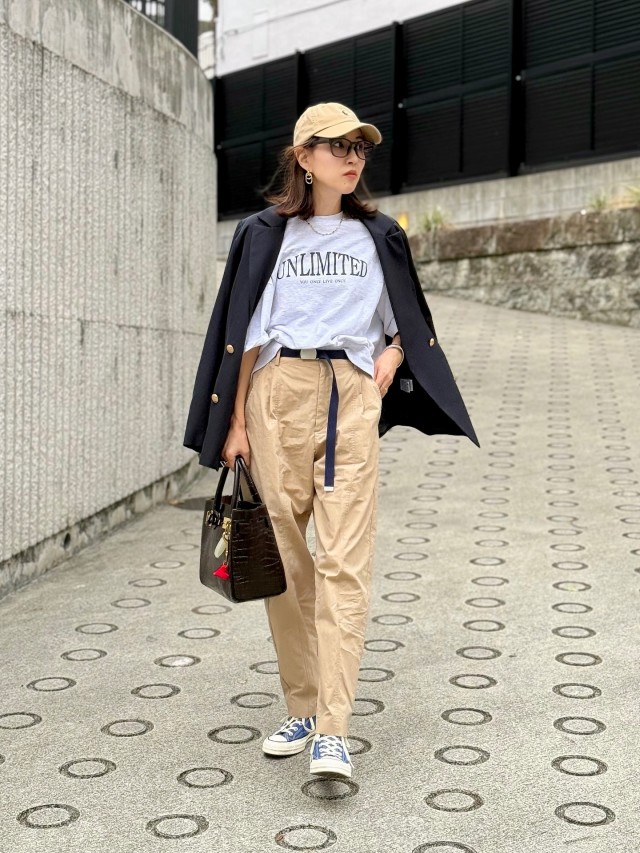 大人っぽいカジュアルスタイルがおしゃれなこちらのスナップは、ネイビージャケットとベージュパンツの間に淡いグレーのTシャツを挟んで爽やかに。さらにキャップもベージュにすることで、コーデの統一感アップ! ネイビーを引き締めカラーにすると、着こなしが重く見えないのに大人感を演出できますよ。