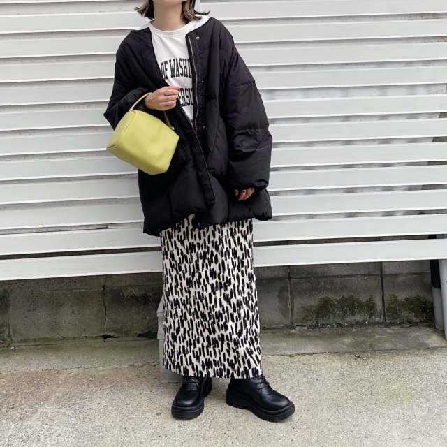こちらは、黒ダウンコートにイエローのハンドバッグを合わせたスタイル。こんな色鮮やかなバッグなら、ダウンコーデのおしゃれなアクセントになってくれます。サッと合わせやすいハンドバッグだからこそ、好きなカラーをチョイスして気分転換するのもおすすめです。