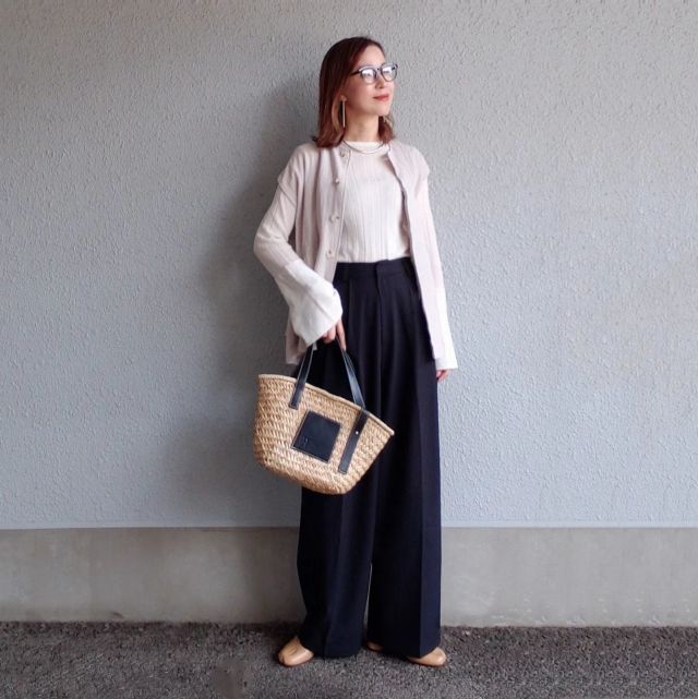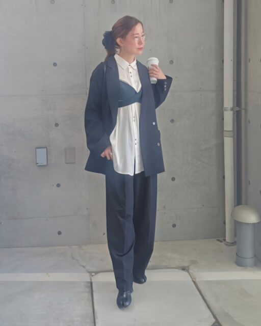 両方ともきちんとした雰囲気があるので、通勤やオケージョンにもぴったりマッチ。パンツスタイルながらきれいめでドレッシーに決まります。